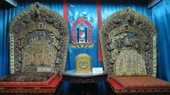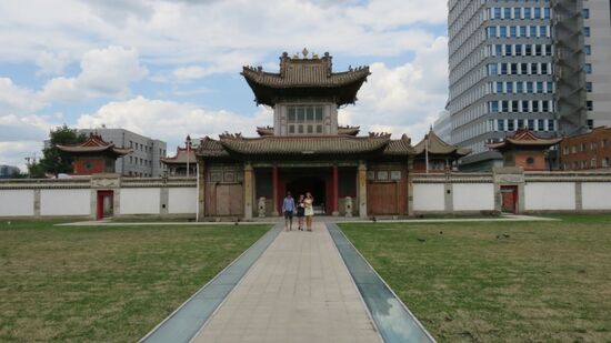 der sich für MNT 5.000 sogar auf den Arm nehmen lässt. Ca. 2km weiter Richtung Innenstadt der Winter Palace of the Bogd Khan (E=MNT 8.000 pP), in dem der letzte König der Mongolei und zugleich Achter Lebender Buddha 20 Jahre lang lebte. Ein beeindruckendes Eingangstor