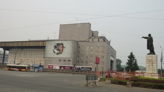 bevor wir uns die Stadt dann von unten anschauen. Lenin im Kreisverkehr zeigt auf den Betonklotz von Theater,
