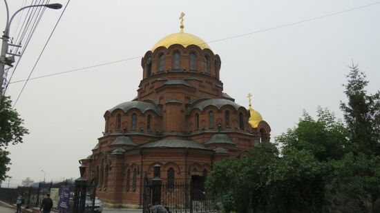 Die Alexander Nevsky Cathedral, von aussen ein roter Backsteinbau mit goldenen Türmen,