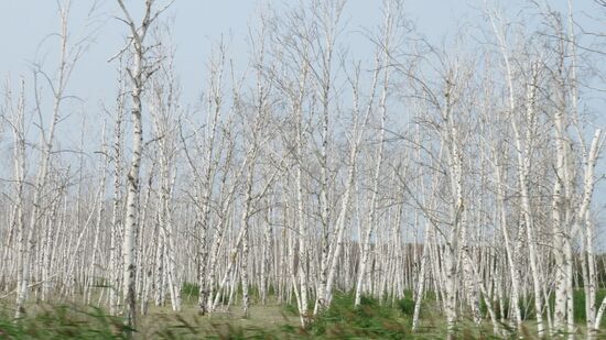 Heute fahren wir weitere 700km mit Haupt-Richtung Westen, vorbei an Quadrat-Kilometern von solchen abgestorbenen Birkenwäldern,