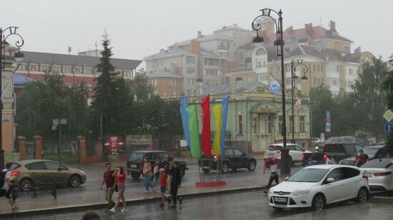 Dann, wie sich schon am Horizont abzeichnete, bricht ein Wolkenbruch über die Stadt herein, was aber der guten Laune wenig Abbruch zu tun scheint, Man stellt sich irgendwo unter, oder noch besser, geht einfach pitschnass im Regen weiter.