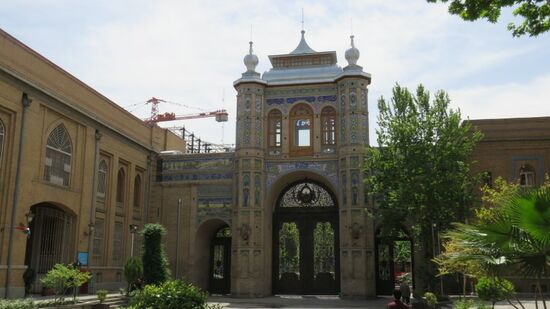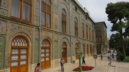 Statt wie vorgeschlagen hinten am Park des ehemaligen Shah-Palast (Golestan Palace) vorbeizugehen, biegen wir um ein paar Ecken und machen uns mal zwischendurch noch an dessen Besichtigung (E= IR150.000 für den Park, dazu kommen noch Tickets für einzelne Räume / Gebäude, für eine komplette Besichtigung werden etwa IR 11.000.000 fällig). Aussen nett dekoriert mit Ziegeln und blau gehaltenen Fliesen,