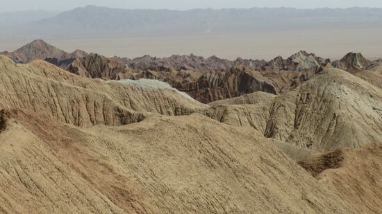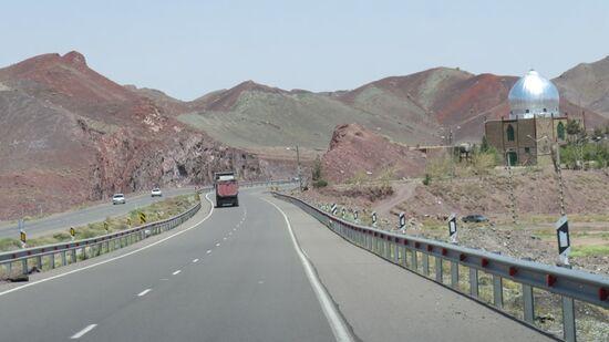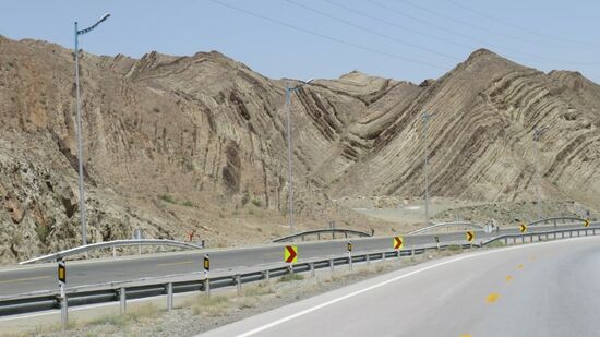Wir fahren Richtung Osten in die Dusht-e Lut, die im Sommer zu den heißesten Wüsten der Welt gezählt wird. Eine Bergstrasse bringt uns erst mal auf gut 2.600m, dann geht es durch einen Tunnel und anschliessend gleich wieder steil bergab bis auf etwa 350m.