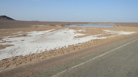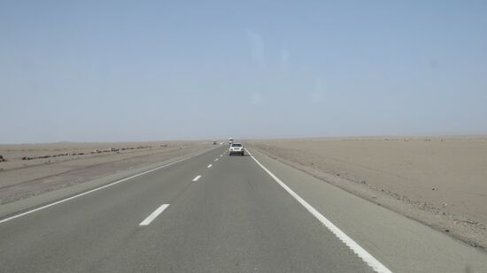 und schliesslich folgen gut 300km Autobahn quer durch den Südrand der Lut Wüste, die hier eine öde, graue Steinwüste ist.