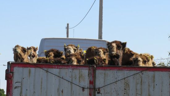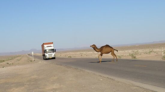 Den heutigen Tag verbringen wir hauptsächlich mit der Jagd nach Diesel. Während bis Yazd das Tanken eigentlich problemlos war, bedarf es seither einer gehörigen Portion Glück und Überredungskunst um den Tank zumindest etwas nachgefüllt zu bekommen. In Nebandan gibt uns ein LKW Fahrer 20l von seinem Kontingent ab, an einer Autobahntankstelle bekommen wir 40l über die Dieselbezugskarte eines Tankwartes aber meist hören wir hier in der Gegend nur: „Keine Karte, Kein Diesel“. Endlich in Birjand die Erlösung, ein LKW Fahrer lässt uns auf seine Karte volltanken, lehnt jeglichen Aufpreis ab, lediglich ein Päckchen ‚Mannerl‘ wird akzeptiert, wir sind wieder reisebereit. Auf dem Weg zurück in die Wüste, dieses Kameltaxi,