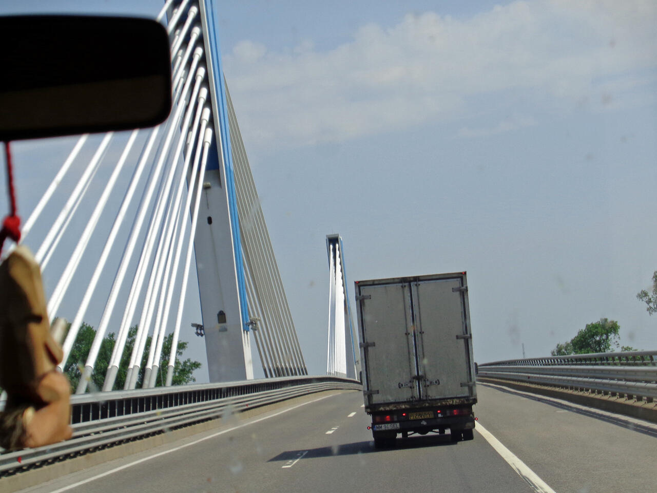 Ab Pecs AB M 60 / M 6 11.15 Uhr. Abfahrt auf 55 nach Baja, es ist schon wieder sehr warm. Störche staksen in den feuchten Wiesen umher, auf der Suche nach Futter. Bei Baja überqueren wir die Donau, Bild - 12 Uhr. 511 Richtung Szeded, weiter 55. Hier kaum Verkehr, Autobahn fast leer. 30 Grad, wir schwitzen. Überall herrlicher roter Klatschmohn zu sehen.
