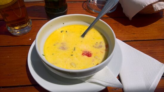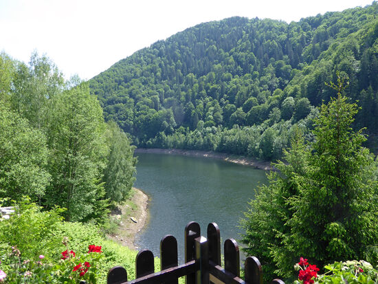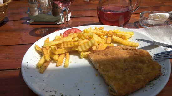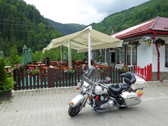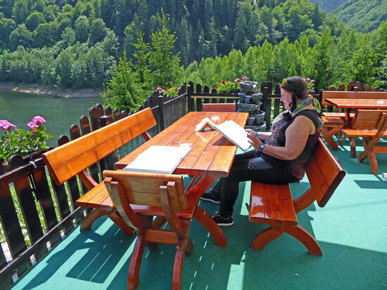 Am Lacul Tau halten wir an einem schönen Restaurant, mit Blicka auf den Stausee. Es hat aufgehört zu regnen, wir sitzen draußen. Die Bedienung hier ist besonders nett und freundlich. Rolf hat natürlich wieder seine Transsilvanische Suppe, dazu alkoholfreies Bier, für mich gibt es Hühnerschnitzel mit Pommes, dazu Wein und Brot, Kosten 10 Euro. Das Brot ist selbstgebacken und schmeckt hervorragend, bereitet keine Magenprobleme. Die nette Bedienung packt uns ein halbes Bauernbrot für Zuhause ein. Leider können wir nicht jeden Tag hierher fahren, das Brot wäre es aber wert.