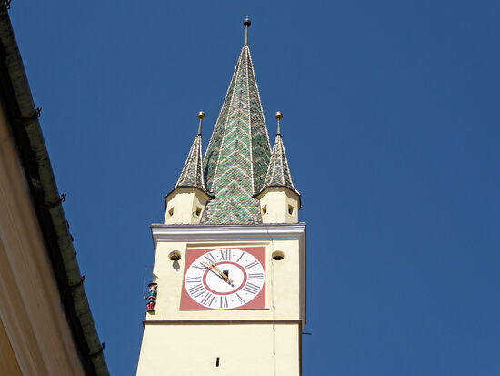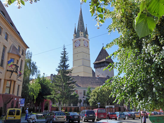Der Trompeterturm oder Turnul Trompetilor dominiert das zentrale Stadtbild. Das Dach des fast 70 m hohen Turmes ist reich mit bunten emaillierten Zierplatten geschmückt und auch die am Spitzdach angebrachte Ecktürmchen verweisen auf die gleiche Bedeutung wie die des Stundturms in Sighisoara. Sie symbolisieren die Hochgerichtsbarkeit, ein Stadtprivileg, das es den Richtern von Medias erlaubte, Todesurteile zu fällen und zu vollstrecken. Eine markante Eigenschaft hat der Turm mit dem Turm zu Pisa gemeinsam: Er steht schief. Als man ihn 1550 auf 68,5 m aufstockte, hatte man wohl das Lot vergessen, so dass der Turm heute oben 2,3 m von der Senkrechten abweicht. Als die schiefe Sache den Bürgern um 1927 zu bedrohlich wurde, verpassten sie dem Turm kurzerhand ein mit Eisen verstärktes Betonkorsett.