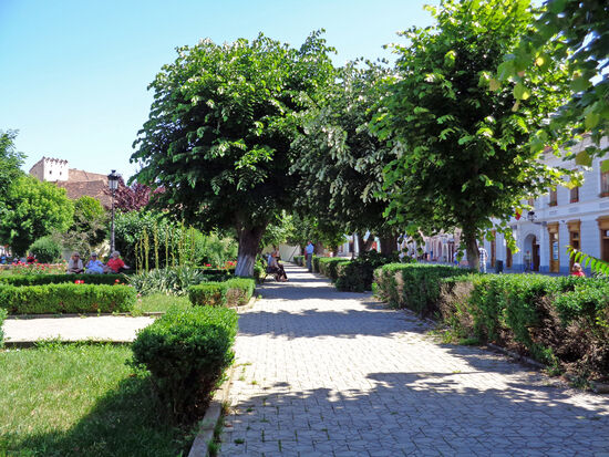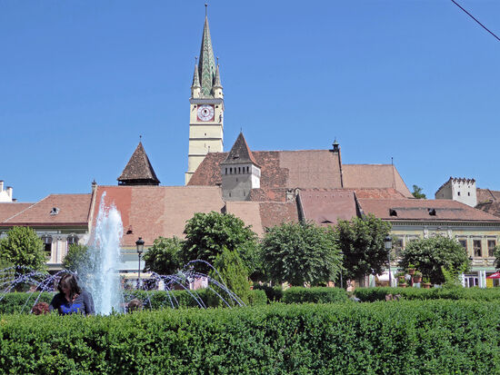 Nach der Besichtigung der Kirche laufen wir weiter zum Piata Regele Ferdinand I. Es ist sehr warm und wir suchen Schatten. Endlich entdecken wir eine Bank unter Bäumen. Ein Rumäne gesellt sich zu uns, der ganz gut Deutsch spricht. Er lebt und arbeitet in Bremen und ist zur Zeit auf Urlaub in Medias.