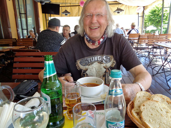 Im Hotel Traube machen wir Mittag. Rolf mit Rindfleischsuppe und alkoholfreiem Bier, ich mit Salat mit Lachs, dazu Wasser, Wein = 13 Euro.