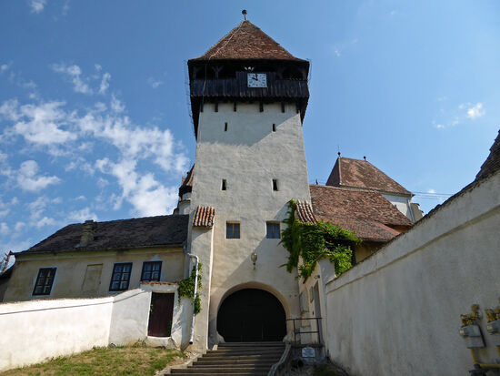 Die Kirche ist von einer hohen Ringmauer umgeben und verfügt über einen Torturm mit Nebengebäuden. Der Torturm schließt nach oben mit einem hölzernen Wehrgang ab und war mit eisenbeschlagenen Holztoren und Fallgattern ausgestattet. Es gab vormals zwei weitere, der Ringmauer vorgelagerte, Türme.