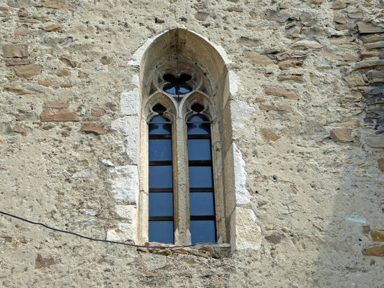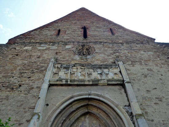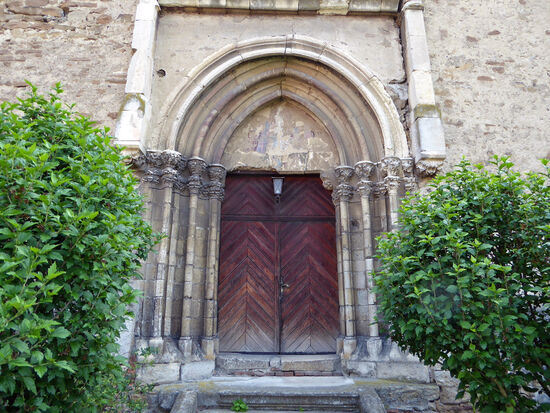 An dem dreifach gestaffelten Trichterportal in der Westfassade mit dem fein gearbeiteten Kämpfer sind noch Reste der Bemalung zu erkennen.