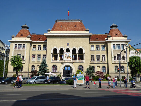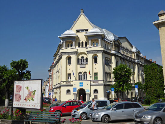 Das Rathaus (Primăria) wurde 1936–1942 im rumänischen Brâncoveanu-Stil erbaut.