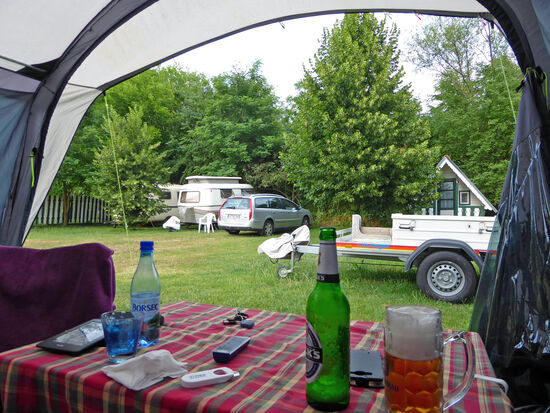 Gegen 15 Uhr sind wir zurück auf dem Campingplatz. Es ist schwül, ein Gewitter naht. Einige Camper sind verschwunden. Ein Neuer, Motorradfahrer aus Israel, mit Zelt ist gekommen. Sehr nett und freundlich. Wir laden ihn zum Wein ein. Er hat 3 Wochen Urlaub und fährt durch Europa. Leider ohne sein Frau (Holländerin), die hat zu viel Angst. Er muss noch 10 Jahre arbeiten, ehe er in Rente gehen kann.