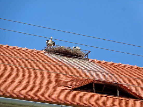Der Glockenturm der evangelischen Kirche (errichtet 1749) steht seit einem Erdrutsch im Jahr 1858 deutlich schief.