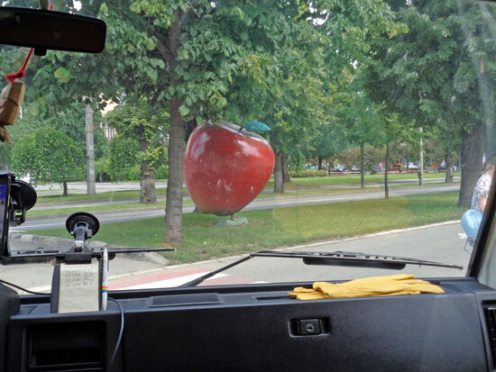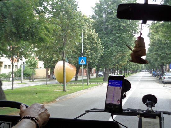 Auf den langen schattigen Alleen, die durch die Stadt führen, sind überall große schöne Apfel-Skulpturen zu entdecken. Leider kann Rolf nicht halten bei dem starken Verkehr, aber das eine oder andere Bild gelingt mir doch.