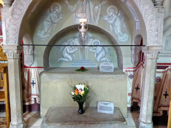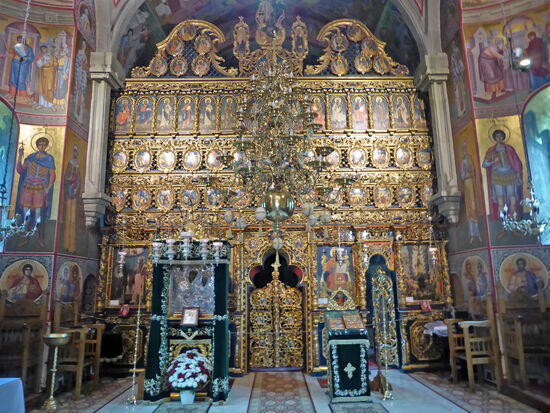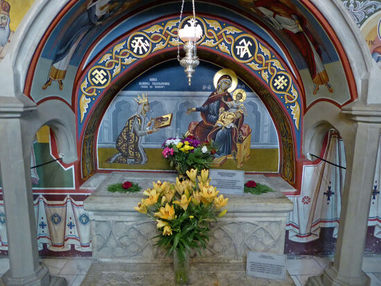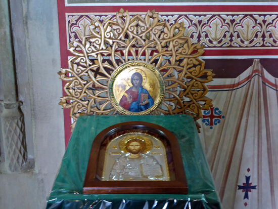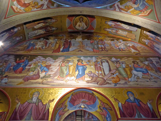 Im Inneren der Klosterkirche sind nun auch die Fresken zu sehen, für die die Moldauklöster so berühmt sind. Auch hier waren die Malermeister Mihail und Gavill Morosan am Werk. Unter einem Baldachin aus weißem Marmor fällt sofort die Grabstätte von Fürst Stefan ins Auge.