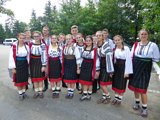 Nach der Besichtigung des Klosters Putna treffen wir auf eine Musikgruppe von jungen Mädchen in wunderschönen Kleidern. Sie geben später ein Konzert und bitten uns, ein Foto von ihnen zu machen. Wir kommen diesem Wunsch gerne nach, ehe wir weiter fahren.
