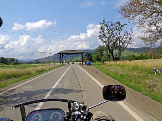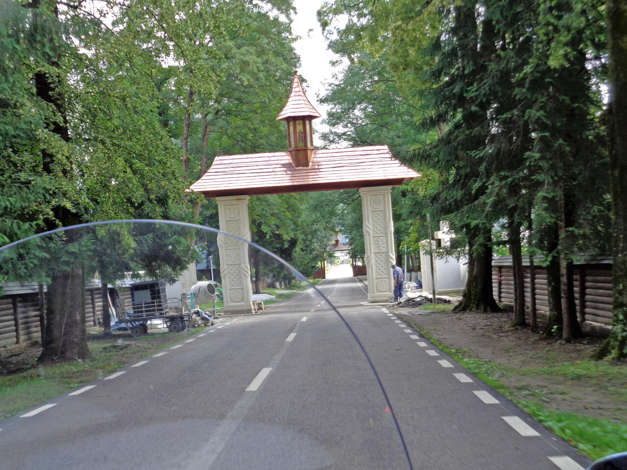 Abfahrt um 8.45 Uhr. Zunächst ist die Straße sehr schlecht, aber die schönen Aussichten entschädigen uns. Auf dem Pasul Ciumarna, 1.109 m, sehen wir eine riesige emporgestreckte weiße Hand – ein sozialistisches Monument. Die schwer entzifferbare Inschrift lässt auch viele Rumänen ratlos zurück, was es mit diesem Denkmal auf sich hat.