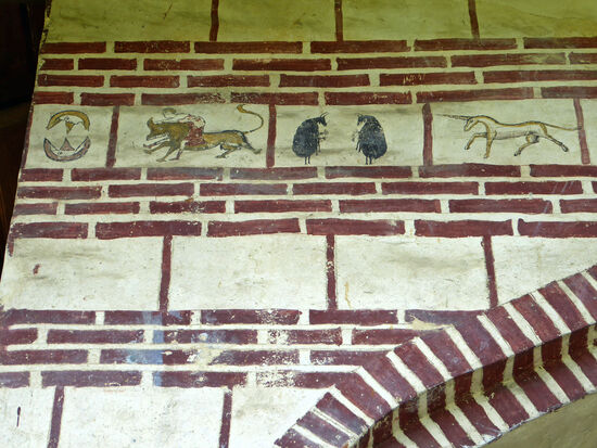 Bedeutend ist unter anderem die Darstellung "Stufenleiter der Tugenden" an der Nordfassade, die eine Leiter zum Himmelstor zeigt. Teufel versuchen die auf der Himmelsleiter hinaufsteigenden Menschen hinunter in die Höllenschlucht zu ziehen, während über der Leiter Engel schweben. Die auf der Treppe hinaufsteigenden Menschen sind wie Mönche gekleidet.
