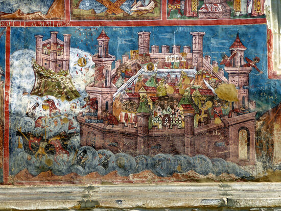 Das bekannteste Fresko am Kloster Moldovița ist die fantastische Darstellung der Belagerung Konstantinopels an der Südfassade. Im Gegensatz zu anderen berühmten Fresken, wie zum Beispiel dem Jüngsten Gericht, das die gesamte West-Fassade des Voroneț-Klosters einnimmt, ist das „Aushänge-Fresko“ von Moldovița fast klein geraten. Es zeigt in unglaublichem Detailgrad eine Szene aus dem Jahr 626, als die Festung des historischen Istanbul einer Belagerung durch die Perser standhalten musste und der Legende nach durch ein Wunder der Jungfrau Maria gerettet wurde (die Feinde im Bild sind allerdings eindeutig als Türken dargestellt).