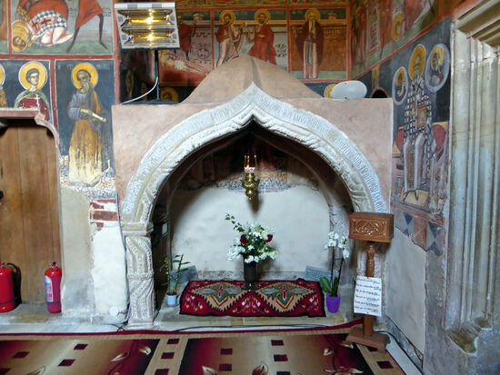 An der nordwestlichen Wand führt eine Steintreppe zu einer Schatzkammer. Recht eigenwillig ist die unübliche Beleuchtung der Grabhalle durch halbzylindrisch gewölbte Fenster auf der Südseite. Grabhallen liegen in allen anderen Moldauklöstern in den dunklen Teilen der Kirche.