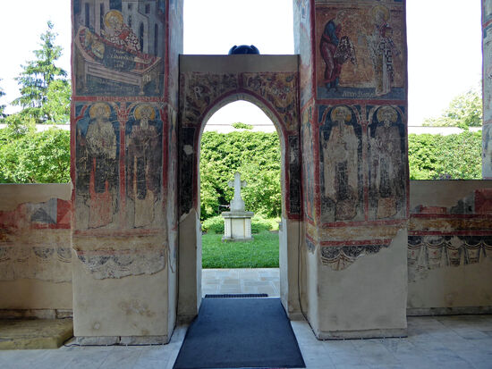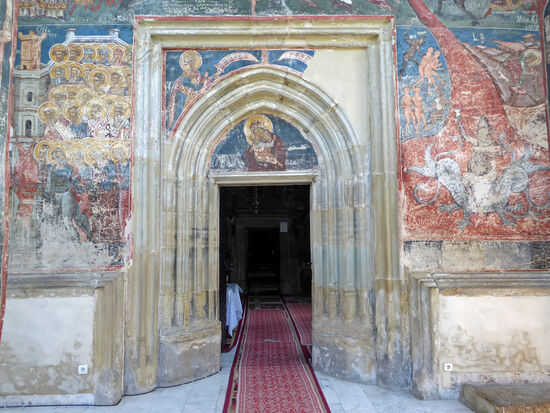 Sowohl die Außenmauer als auch das Innere des Vorbaus schmücken Szenen aus dem Jüngsten Gericht, mit dem glutroten Fluss aus Feuer und dem Meer der Verdammten. Die prächtigen Malereien an der Ostfassade des Klosters sind durch die Verwitterung jedoch kaum noch zu erkennen.