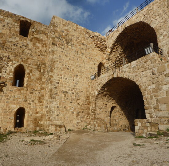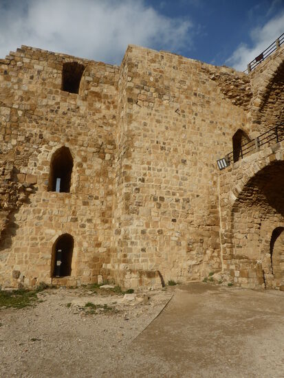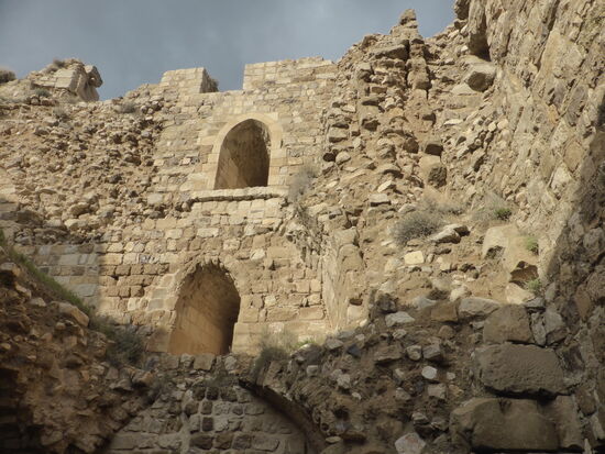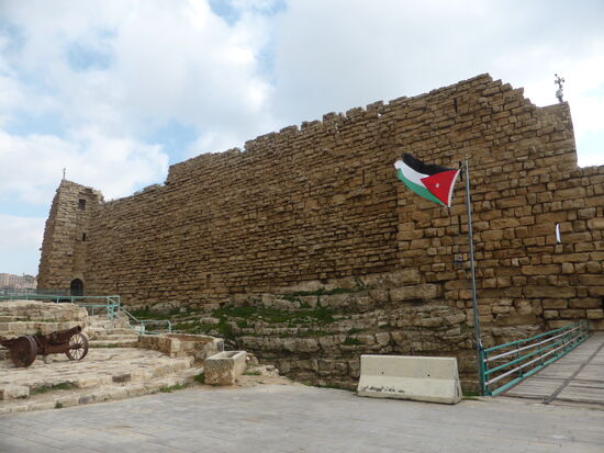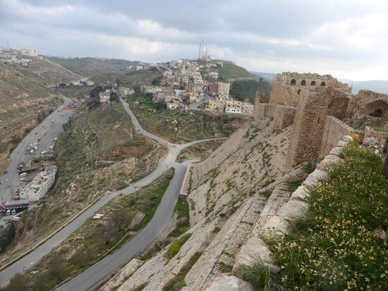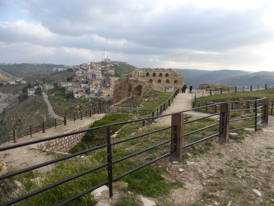Hoch auf einem Felssporn liegt eine riesige Burganlage, die aufgrund ihrer exponierten, strategisch günstigen Lage von vielen Herrschern genutzt. wurde. So ist z.B. nachgewiesen, dass bereits die Assyrer, die das Königreich Moab 733 v. Chr. unterworfen hatten, dort anwesend waren. Dann aber ist erst von den Nabatäern und Römern die Rede. Später kämpften Kreuzritter und Saladin um die Burg. Im 13. Jh. waren es die Mamluken. Dann im 19. Jh. Osmanen und Türken.