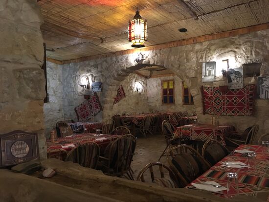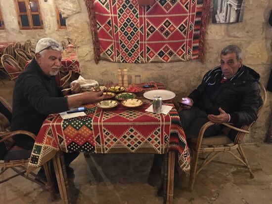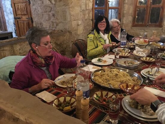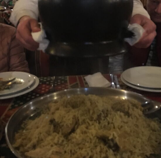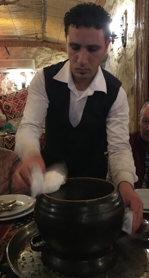 Schließlich und endlich landen wir gegen 21.30 Uhr in einem netten Restaurant, wo man uns schon erwartet uns sofort auftischt. Wie gewohnt diverser Vorspeisen, als Hauptgang gibt es Köfte und den umgedrehten Topf, den Khalil uns schon mittags vorführte. Dazu gibt es Wasser.