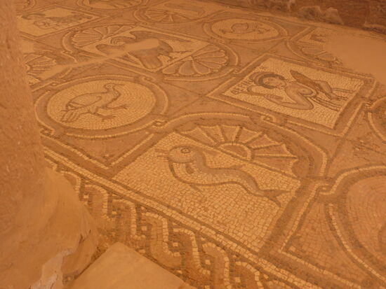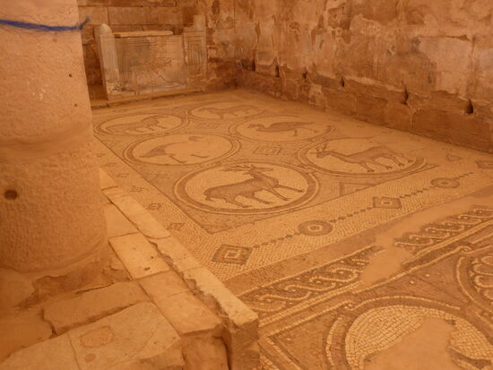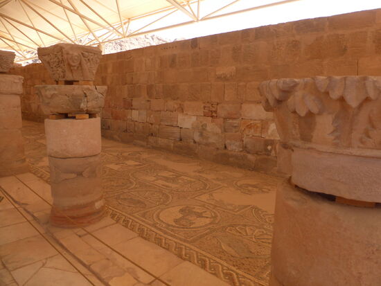 Schließlich gelangen wir zu den Resten der byzantinischen Kirche, deren gut erhaltene Mosaiken durch ein Dach vor Witterungseinflüssen geschützt sind.