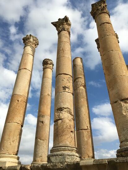 Die abwechslungsreiche Geschichte von Gerasa beginnt etwa 6000 v. Chr.. Doch erst Alexander dem Großen ist die Entwicklung zu nennenswerter Größe zu verdanken. Zeitweise wurde sie Antiochia Chrysorhoas (Goldfluss) genannt. Als die Nabatäer ihr Reich auch nach Norden ausdehnten, entwickelte sich Gerasa zwischen 84 und 72 v.Chr. zu einem Handels-Stützpunkt auf dem Nordabschnitt der Weihrauchstraße nach Damaskus. Unter den Römern wuchs die Siedlung u.a. auch durch die Erzfunde in den Bergen von Ajlun zu einer wohlhabenden Stadt.