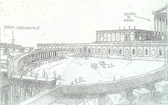 Aufgrund der Topographie, der Zugang zum Zeustempel ist winklig zur Achse des Cardo, ist der Platz oval ausgeführt, und es ergibt sich durch den architektonischen Kniff der Eindruck eines runden Platzes. Der 80 x 90 m messende mit Steinplatten geflasterte Platz ist von ca. 60 Säulen umgeben, früher lagen darum herum Ladengeschäfte.