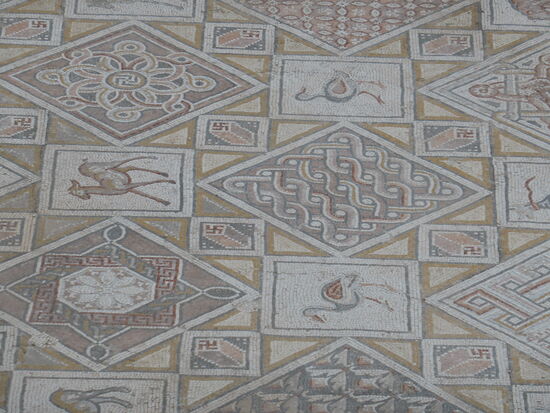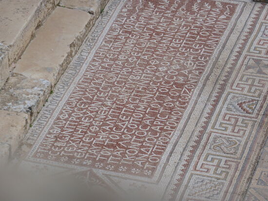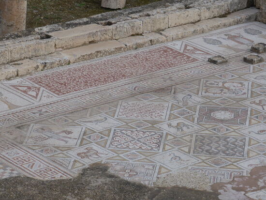 Wegen der sehenswerten Bodenmosaike laufen wir weiter nordwestlich zur St.-Cosmas-St.-Damian-Kirche, deren Stifter Zwillingsbrüder waren. Mit den Bodenmosaiken hat sich das Stifterpaar hier neben diversen Tieren, wie Schafen und Gazellen, verewigen lassen. Man kann jedoch nur über die relativ hohe Mauer schauen, da die Gebäudereste nicht zuganglich sind- Die Kirche ist direkt an die St.-Johannes und die St.-Georg-Kirche angebaut, so dass das Ensemble allgemein als Dreifachkirche bezeichnet wird.