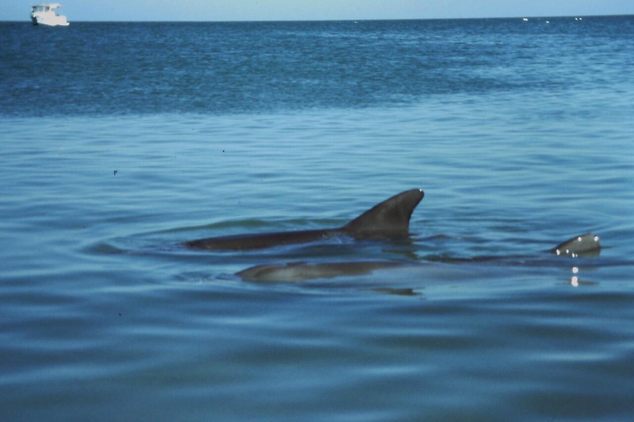 Am anderen Morgen um 8 Uhr fand die erste Delphin-Fütterung statt. Drei Delphinmütter mit Jungen kamen dicht an den Strand und wurden mit Fischen gefüttert.