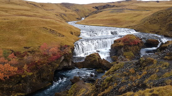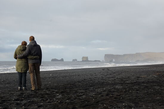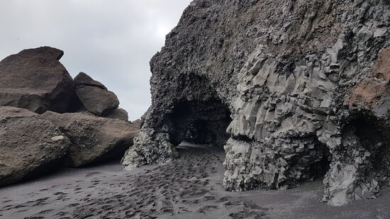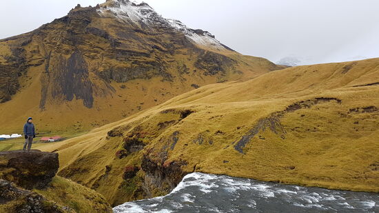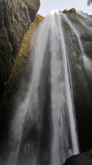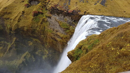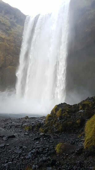 Heute Morgen sind wir nochmal zum Fjallsarlon Beach gefahren in der Hoffnung, dass etwas weniger los ist als gestern Abend. Gegen 10 Uhr war hier allerdings schon die Hölle los und auch einige Reisebusse dort. Dennoch haben wir uns heute etwas mehr Zeit genommen, um den Strand mal bis zum Ende der kleinen Bucht zu laufen und noch ein paar schöne Fotos zu machen. Auf die Wanderung zum Leuchtturm und die Besichtigung des Flugzeugwracks in Solheimasandur haben wir verzichtet, da beides jeweils ca. 2 Stunden gedauert hätte und wir uns nicht allzu viel davon versprochen haben. Stattdessen sind wir danach direkt weiter zum Skogafoss Wasserfall. Hier kann man rechts vom Wasserfall über einige Stufen bis nach nach oben klettern. Oben angekommen sollte man den Weg noch etwas weiter gehen, dort kommt noch ein sehr schöner zweiter Wasserfall. Die schönste Ansicht auf den Skogafoss hat man aber sicher von unten wenn man direkt bis an den Fuß läuft. Allerding ist die Gischt dort so groß, dass es schwer ist mit der Kamera ein vernünftiges Bild zu machen weil die Objektivlinse sofort voller kleiner Wassertropfen ist. Mit dem Handy ging das etwas besser. Die noch größere Herausforderung war aber sicher den Wasserfall mal ohne posierende Menschenmassen auf die Linse zu bekommen.