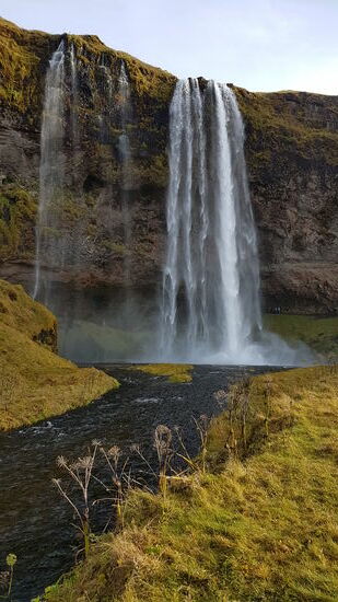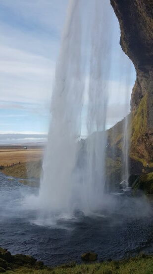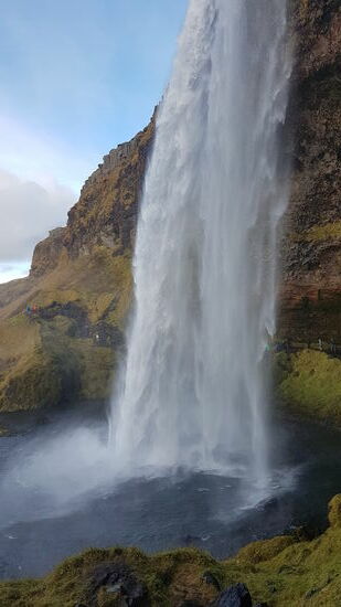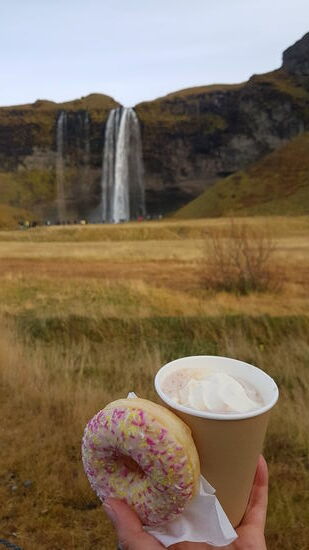 Danach sind wir direkt weiter zum Seljalandsfoss und hatten natürlich das gleiche Problem mit den Menschenmassen. Wir sind zunächst zu dem kleinen Wasserfall links vom Seljalandsfoss gelaufen (einfach ca. 10 Minuten Fußmarsch ohne Anstieg). Dieser ist in einer kleinen Schlucht in welche man nur kommt wenn man über ein paar Steine bzw. einen kleinen Fluss klettert. Man wird etwas nass aber wenn man es nicht drauf anlegt hält es sich in Grenzen. Danach war der Seljalandsfoss auch schon etwas mehr in der Nachmittagssonne. Um ihn komplett von der Sonne angestrahlt zu sehen (falls das überhaupt passiert wäre) hätten wir aber vermutlich noch bis mindestens 18 Uhr warten müssen, was wir dann nicht getan haben. Dieser Wasserfall ist wirklich außergewöhnlich und deswegen einer meiner Favoriten. Man kann einen Rundgang machen, welcher unter bzw. hinter dem Wasserfall hindurch führt. Auch hier wird man spätestens von der Gischt etwas nass, aber auch hier kann man selbst beeinflussen wie nass man wird. Wenn man natürlich meint man muss bis nach ganz unten kraxeln um das beste Selfie zu schießen, dann sollte man wohl besser ordentlich wasserfeste Klamotten anziehen. Wir haben uns mit der Aussicht von oben begnügt und waren ziemlich begeistert. Danach waren wir allerdings trotzdem durchgefroren weil die Klamotten doch recht klamm waren. Direkt am Parkplatz gibt es einen kleinen Imbiss der süße Leckereien wie Donuts, Krapfen und leckere Kuchen anbietet. Die Preise fand ich noch akzeptabel, ein Kaffee hat 350 Kronen gekostet, eine heiße Schokolade 450 Kronen (bzw. 550 Kronen mit Sahne) und ein Donut beispielsweise 350 Kronen. Die Kuchenstücke waren etwas teurer, sahen aber sehr lecker aus. Ich hab mir eine heiße Schoki mit Sahne und einen Donut für insgesamt 900 Kronen gegönnt und mir beides mit Aussicht auf den Wasserfall schmecken lassen. Im Anschluss ging es schon weiter zum Hotel nach Hella. Auch hier haben wir am Abend wieder versucht Nordlichter zu jagen und sind ein Stück außerhalb gefahren, um den vielen Lichtern in Hella zu entgehen. Diesmal blieb unsere Jagd aufgrund der aufziehenden Wolkendecke allerdings erfolglos.