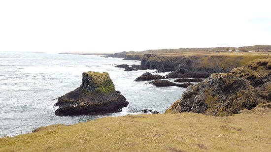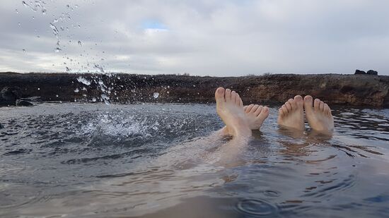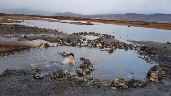 Auf dem Weg zur Halbinsel haben wir gleich morgens (nachdem man am Eldborg Krater vorbei gefahren ist – welchen wir als unspektakulär empfunden haben und deswegen weiter gefahren sind) einen kurzen Zwischenstopp am Hot Pot Landbrotalaug eingelegt. Diese natürliche heiße Quelle (kostenlos!) ist sicher längst kein Geheimtipp mehr, aber wir hatten dennoch Glück und waren anfangs alleine da. Das heiße Wasser kommt über ein Rohr in das Becken. Das Wasser ist hier nicht sonderlich tief aber man kann sich sehr gemütlich reinlegen und den Kopf anlehnen. Ein paar Meter weiter gibt es noch den eigentlichen HotPot, ein sehr kleines tiefes Loch (max. 2 Personen) in dem man stehen kann. Die Anfahrt zu diesem HotPot kann man gut im Internet recherchieren. Am Parkplatz gibt es auch ein Dixie Klo. Umziehkabinen oder ähnliches gibt es jedoch nicht, deswegen heißt es nach dem heißen Bad ab durch die Kälte (bei uns war es furchtbar windig) zurück zum Auto und dort umziehen. Der Ausflug hat sich aber auf jeden Fall gelohnt und ein solches Bad sollte bei einem Island Urlaub meiner Meinung nach nicht fehlen. Zugegebenermaßen, im Wasser ist es super schön warm aber das rausgehen und der kurze Fußmarsch zurück zum Auto waren bei diesem Wetter schon leicht unangenehm .