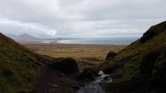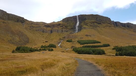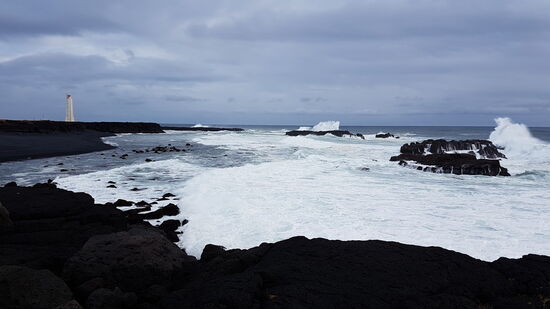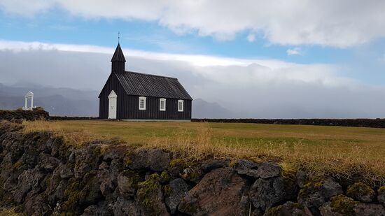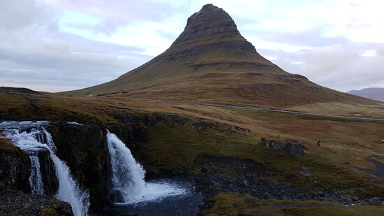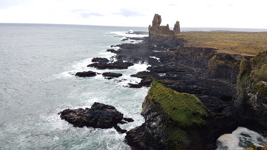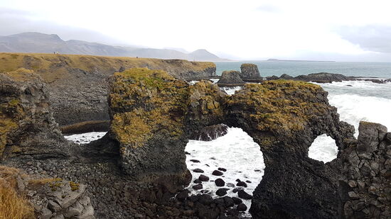 Danach ging es weiter mit den Klassikern auf der Halbinsel: der Strand Ytritunga (landschaftlich sehr schön, wir haben sogar noch 3 Robben auf den Felsen gesehen), die berühmte schwarze Kirche Budir, eine kleine Wanderung in die Schlucht Raudfeldargja und das krakseln zum Wasserfall in der Schlucht (nasse Füße inklusive, etwas Geschick erforderlich), der Steinbogen Gattlekur (den kompletten Fußweg von Arnarstapi nach Hellnar mit 45 Min. einfach haben wir aus Zeitgründen und wegen des starken Windes und der eisigen Kälte ausgelassen), ein Blick auf den Gletscher Snaefellsjökull (wir sind nicht hoch gefahren), die Felsspitzen bei Londrangar, der schöne schwarze Strand Djupalonssandur, der Krater Saxholl sowie der berühmte Berg Kirkjufell mit dem gleichnamigen Wasserfall Kirkjufoss (hier waren wir zum Sonnenuntergang, allerdings war es ziemlich bewölkt). Da wir noch eine relative weite Rückfahrt zum Hotel vor uns hatten, haben wir den geplanten Abstecher zum Leuchtturm Sugandisey im Städtchen Stykkisholmur leider nicht mehr geschafft. Auch zum Leuchtturm Öndverdarnes an der Westspitze sind wir aus Zeitgründen nicht mehr gefahren (einfach 20 Minuten Anfahrt über Schotterpiste). Alles in allem haben wir unfassbar viel gesehen an diesem Tag, mehr wäre auch nicht mehr gegangen, die Zeit verging wie im Flug. Hier bietet sich eine Übernachtung in der Nähe an.