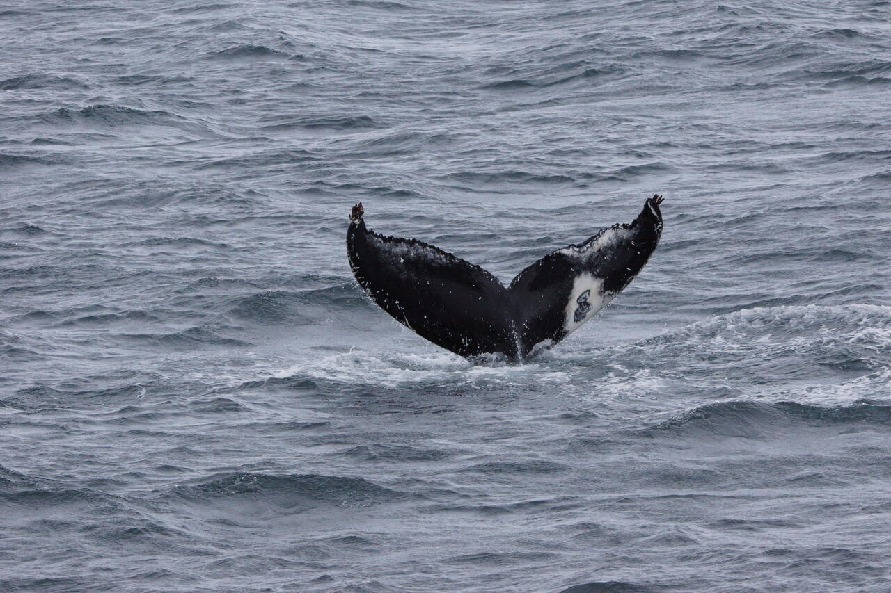 Der heutige Tag startete mit Regen und auf dem Weg nach Akureyri muss man über einige Berge fahren, wo wir von heftigem Schneefall überrascht wurden. Da wird einem schon anders im Mietwagen mit Sommerreifen. Wir hatten Glück, in unsere Richtung ging es meistens bergab, die entgegenkommenden Mietwägen hatten am Berg schon mächtig Probleme und sind ordentlich weg gerutscht oder konnten teilweise kaum mehr anfahren. Ein Auto haben wir sogar im Straßengraben entdeckt, zum Glück ist den Insassen nichts passiert und der Abschlepper war bereits informiert. Wir waren jedenfalls sehr froh, als wir in Akureyri heil angekommen sind. Wir hatten am Morgen noch spontan eine whale watching Tour gebucht. Die deutlich teurere 2-stündige Tour mit dem Speedboot kam für uns nicht infrage (wegen Schwangerschaft), deswegen haben wir die 3-stündige Tour auf einem größeren Boot gebucht. Etwas verwirrend war, dass das Büro zwar direkt am Wasser lag, wir aber erst mal 20 Minuten mit dem Bus in einen Hafen weiter nördlich gebracht wurden, von dort ging es dann los, ca. 3 Stunden waren wir auf dem Wasser unterwegs. Auf dem Boot haben wir uns direkt einen Überlebens-Anzug geschnappt, weil wir die komplette Fahrt außen verbringen wollten. Man hätte bei diesem Boot auch innen sitzen und sich an der Bar heiße Getränke kaufen können. Wir haben bei diesem Ausflug einen Buckelwal gesehen und auf dem Rückweg einen Minkwal (den wir selbst leider verpasst haben) und ein paar Schweinswale. Der Buckelwal war immer eine Weile an der Wasseroberfläche, hat dann seine Schwanzflosse aus dem Wasser geworfen und ist abgetaucht. Danach ist er meist 5-10 Minuten unter Wasser verschwunden und wir haben gewartet, bis er wieder auftaucht. Auf jeden Fall ein toller Ausflug an einem ansonsten bis dahin sehr verregneten Tag. Wieder etwas verwirrend war, dass es auf der Rückfahrt nicht mehr zum Busstop ging, sondern direkt in den Hafen nach Akureyri, der Rückweg war also deutlich länger. Da wir das nicht wussten, hatten wir unsere Anzüge zu früh ausgezogen und sind nach innen umgezogen, deswegen haben wir leider auch den Minkwal verpasst. Etwas ärgerlich, aber vermutlich hatten wir uns einfach nicht ausreichend über den Ablauf informiert.