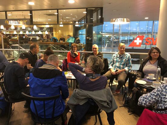 Jetzt ist aber erst einmal Bastelstunde angesagt. Mit Buchstaben und Zahlen, mit Smilies und Herzli schmückt jeder seine Flasche, so dass sie einfach zu erkennen ist. Das gibt schon ersten Gesprächsstoff und bei einem feinen Cappuccino geht die Zeit bald vorbei und wir gehen zum Gate.