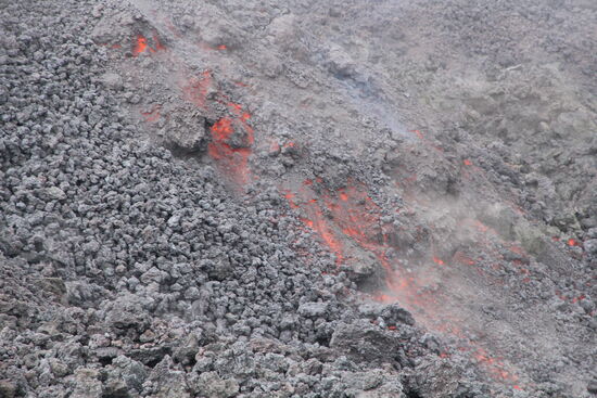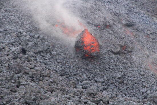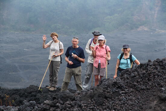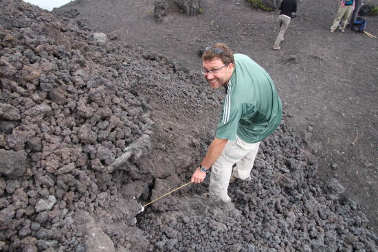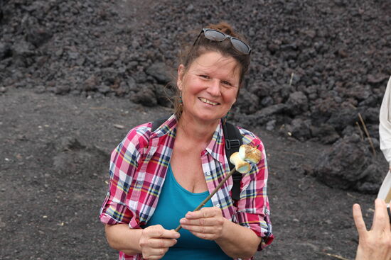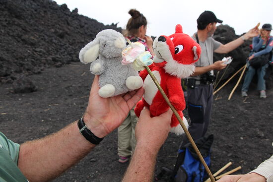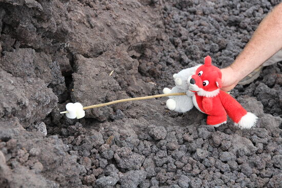 Bis zum Lavafeld geht der Aufstieg durch eine reiche Vegetation. Das Geröll im Lavafeld ist ziemlich scharfkantig und es heisst aufpassen, dass man nicht stolpert. Irgendwann wird es unter den Schuhen warm und Dämpfe steigen in der Nähe auf. Unterirdische Lavaströme und oberirdisches Abbröckeln von flüssigem Stein. Und dann fehlen nur die Würste. Dafür hat Rony Mash Mellows mitgebracht. Die schmecken nie so gut wie wenn sie in der Lava geröstet wurden.