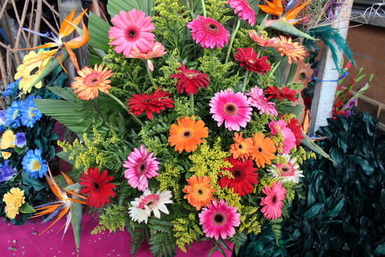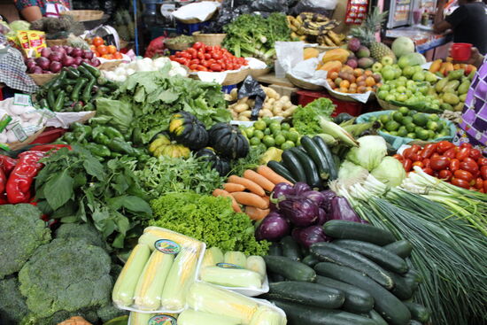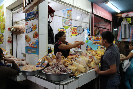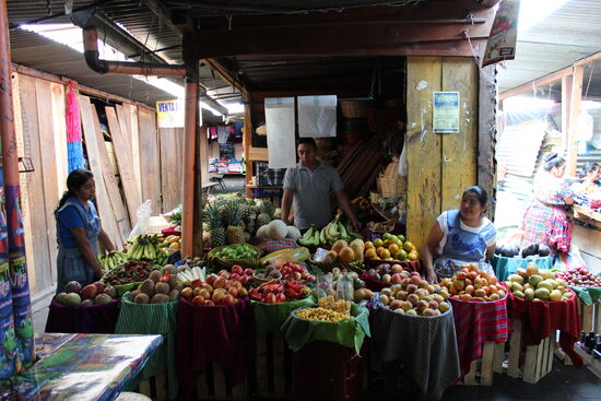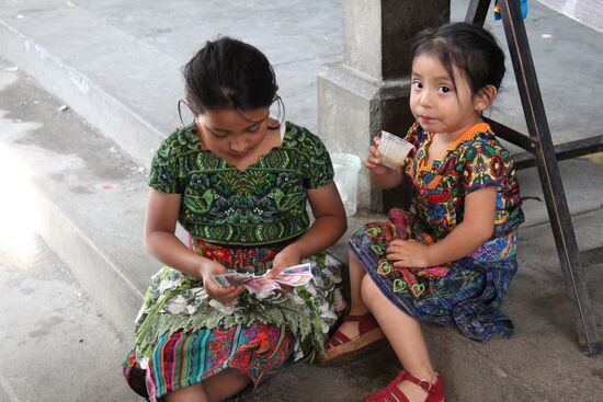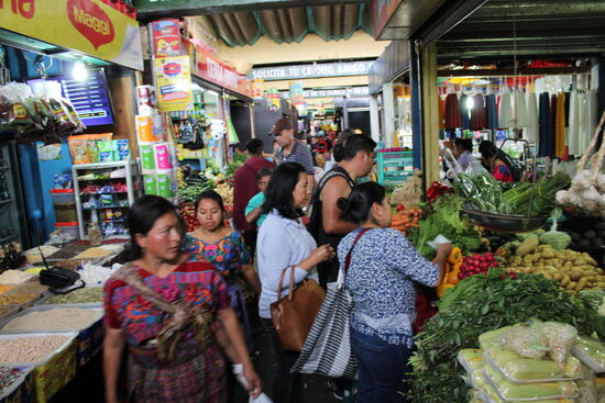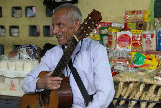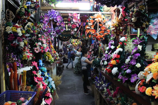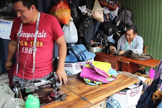 Wir gehen zuerst auf den Markt. Auf den lokalen Markt, wo unter dem Wellblechdach alles angeboten wird. ALLES. Und zwar ziemlich durcheinander. Viele Kleider, viele Schuhe, Pinatas für Kindergeburtstage, Blumengebinde mit künstlichen und echten Blumen, Papeterieartikel, Fleisch, Gemüse, Früchte, Gewürze, Weihrauch, Kerzen. Dazwischen Verpflegungsstände, Friteusen, Grills, Kochtöpfe. Und mitten drin spielende Kinder, oder gar ein Musikant. Irgendwo entdecken wir ein Nähatelier mit uralten Nähmaschinen. Hier bringt man seine Kleider zum Flicken oder ändern.