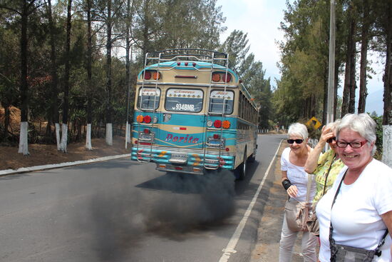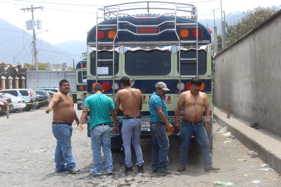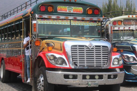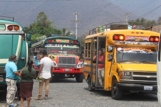Gleich neben dem lokalen Markt ist der Busbahnhof. Von hier starten die farbigen öffentlichen Busse. Die meisten fahren in die Hauptstadt und die Adjudanten suchen eifrig Passagiere. Guate! Guate! rufen sie und jeder will mehr Passagiere im Bus haben, bevor er los fährt. Der Bus fährt erst, wenn er mindestens zur Hälfte gefüllt ist.