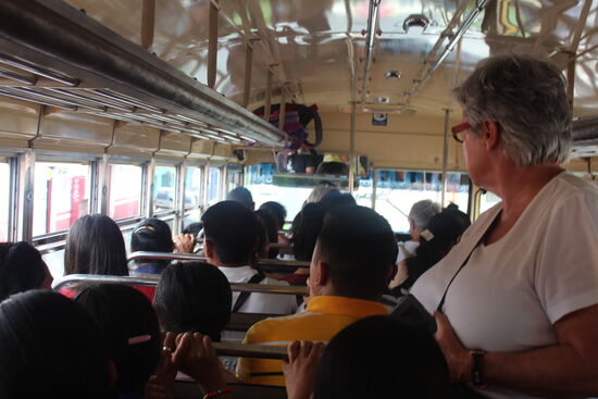 Und da kommt er, scheint ein rassiger Fahrer zu sein, er schwenkt mit Karacho ein und stoppt im letzten Moment, als wir uns schon längst mit einem Sprung in Sicherheit gebracht haben. (Vielleicht ist 'Sprung' jetzt doch etwas übertrieben für uns Damen). Der Bus steht und spuckt seine Passagiere aus. Während die ersten schon versuchen, einzusteigen. Einige müssen von hinten eingestiegen sein, denn als wir uns endlich durchgesetzt haben und im Bus stehen, ist dieser bereits voll. Ob wir da irgendwie noch Platz finden? Nach hinten, nach hinten, drängt uns der Adjudante. Der kann gut sagen, da stehen sie auch schon im Gang. Aber er will, dass wir ihm Platz machen, also versuchen wir, uns irgendwo zu setzen. So wie es auch die Einheimischen tun. Sie sitzen im Gang, sitzen zu dritt auf den Zweierbänken, und einer setzt sich dazwischen. Auf einer Seite mit der Pobacke am Sitz. Kinder sitzen auf dem Schoss, bleiben auf dem Arm der Mama.