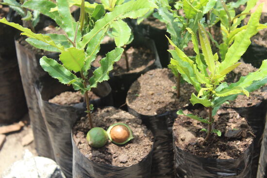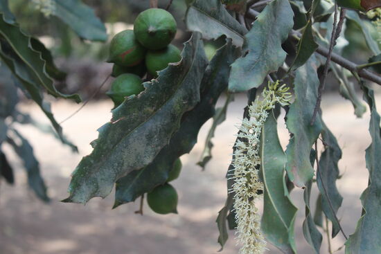 Marvin führt uns herum. Die Macadamia ist eine interssante Pflanze, die während des ganzen Jahres Nüsse liefert. Blüten und Nüsse am gleichen Baum. Sie enthält sehr viele lebenswichtige Vitamine, tut Haut und Haaren gut, und dem Hirn, wirkt gegen Krebs und andere Krankheiten (Originalton Marvin) und ist eine wichtige Ergänzung zu der einseitigen Nahrung der Menschen in den Dörfern. Ausserdem kann sie gut verkauft werden und ist dadurch auch eine Einnahmequelle.