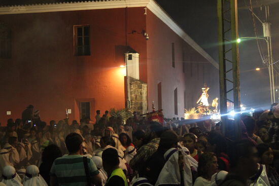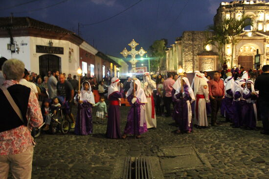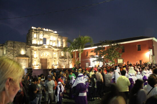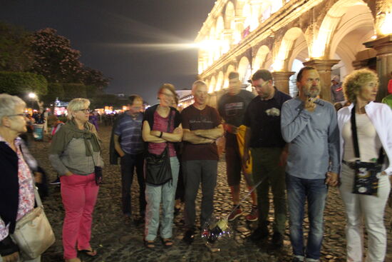 Auf dem Weg zum gemeinsamen Nachtessen treffen wir auf eine erste Prozession. Auch einen Teppich, gemacht aus farbigem Sägemehl und Blumen entdecken wir in der völlig überfüllten Stadt. An ein Durchkommen ist kaum zu denken. Auch auf dem Rückweg begegnen wir wieder einer Prozession. Da wir davon am Karfreitag noch mehr sehen werden, verzichte ich an dieser Stelle auf die genauere Beschreibung und lasse nur ein paar verwackelte Bilder stehen.