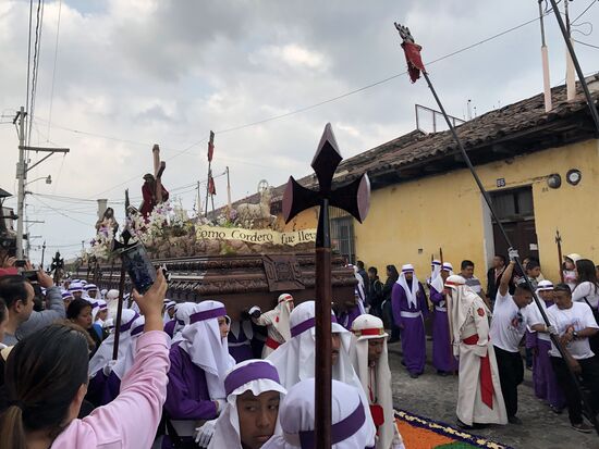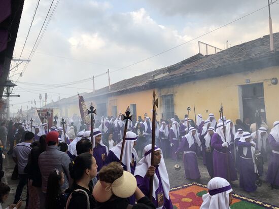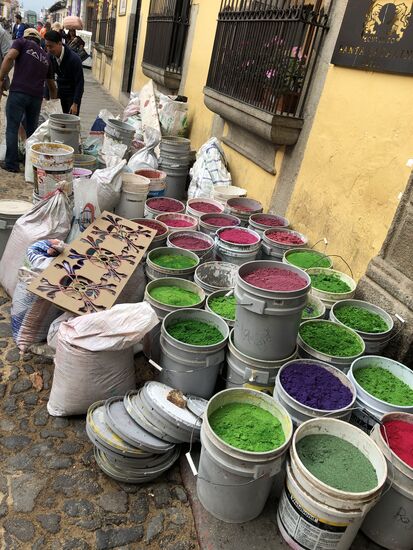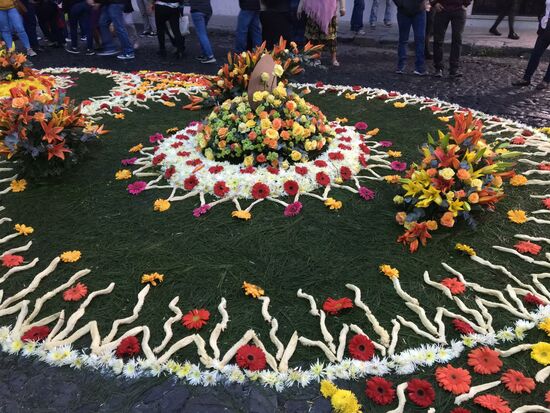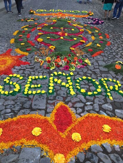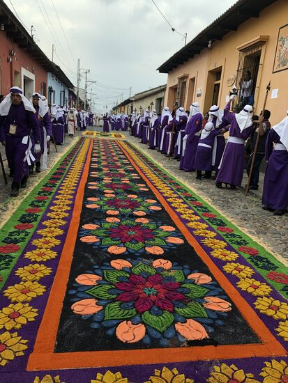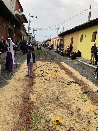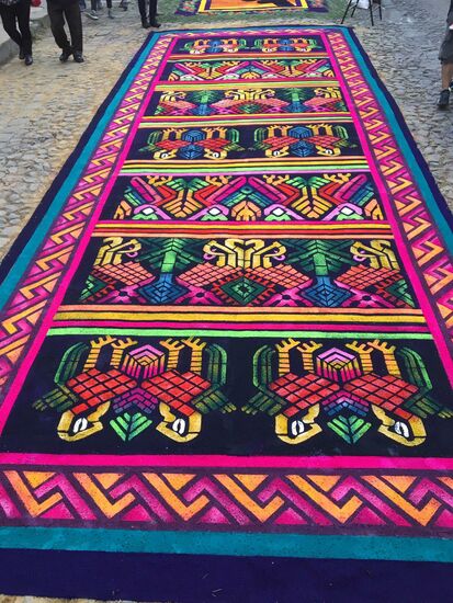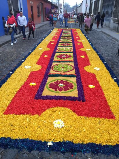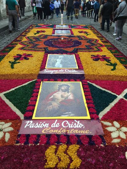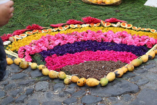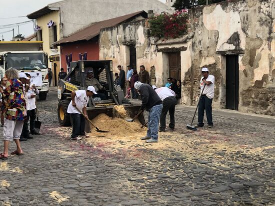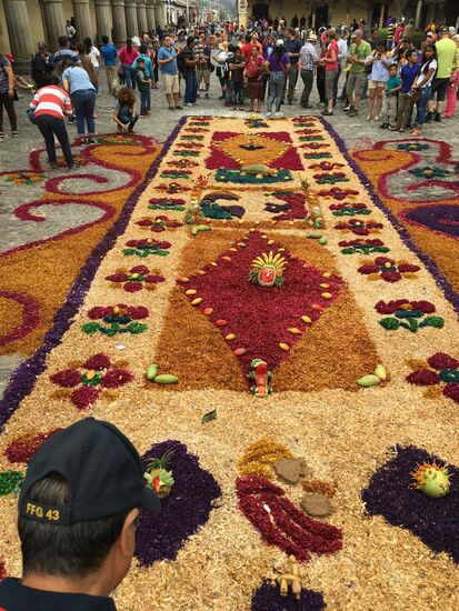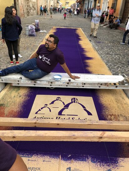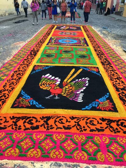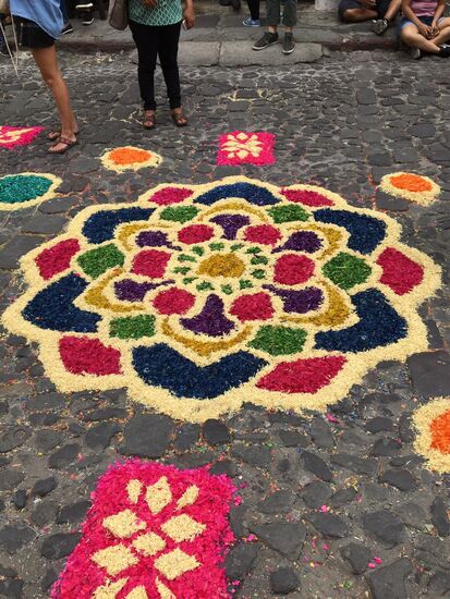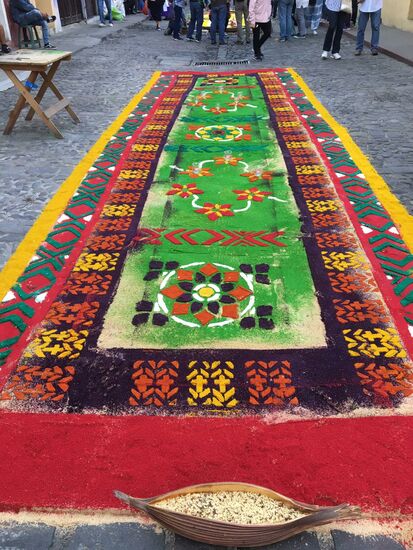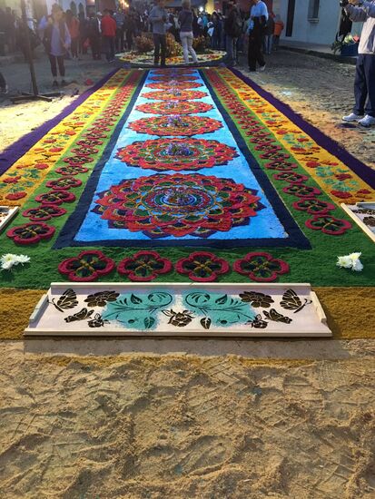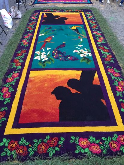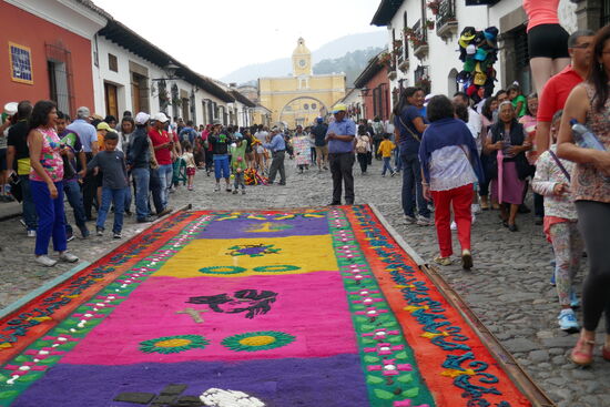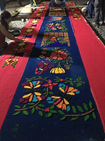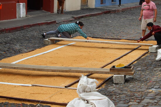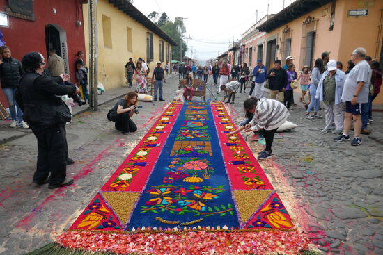 Die ganze Nacht vom Donnerstag auf Karfreitag werden in den Strassen von Antigua Teppiche hergestellt. Es sind eigentliche Kunstwerke, kreiert von Künstlern, geplant, ausgemessen und erstellt von unzähligen Helfern.