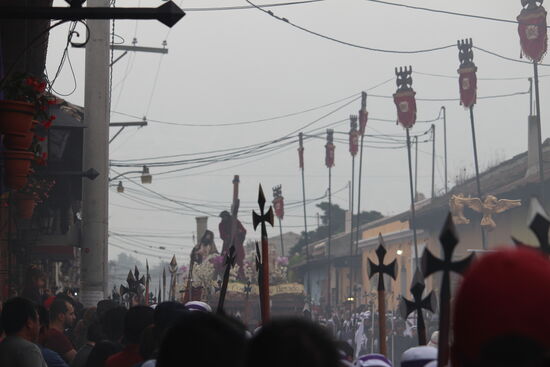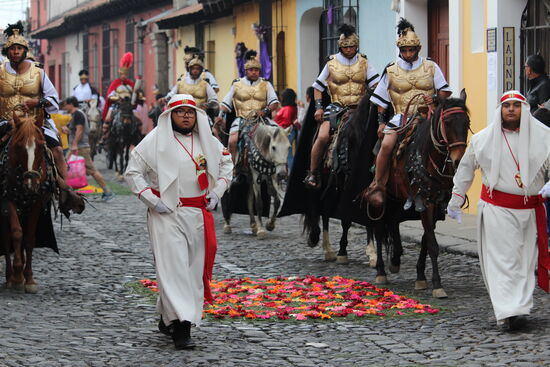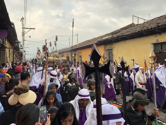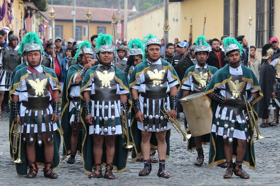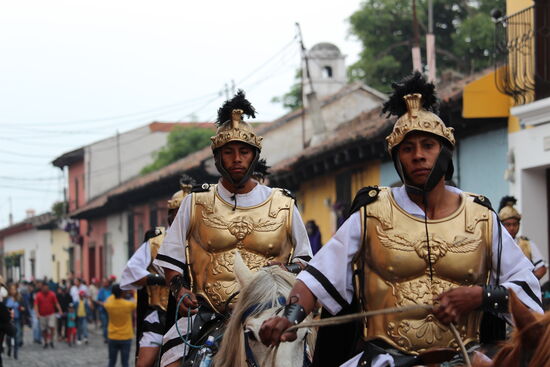 Lange Reihen von violett gekleideten Männern gehen der Prozession voraus. Sie halten die Strasse frei, so dass der Schrein ungehindert durchkommt. Mit ihnen sind ganze Legionen von Römern unterwegs. Mit Helm und gepanzertem Oberkörper vermitteln sie eine Stimmung wie im Mittelalter, oder eben zu Christi Tod.