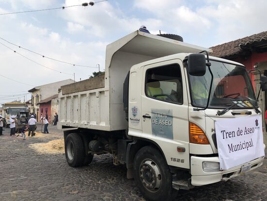 "Tren de Aseo" steht auf dem Plakat des LKW. "Zug der Sauberkeit". Männer putzen mit grossen Besen und schaufeln die Überreste in den Bagger, der alles in einen der LKWs kippt. Es sind vier Reinigungsequipen und sie nehmen alles mit, wenn die Leute nicht klar deklarieren, dass sie einen neuen Teppich machen wollen.