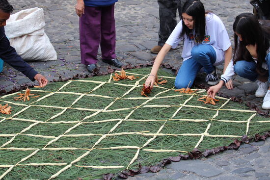 Überall werden neue Teppiche erstellt. An den Seiten stehen die Säcke mit dem farbigen Sägemehl, Schablonen liegen bereit, Leute geben Anweisungen, andere, auch spontane Zuschauer und Touristen, sind zur Mithilfe eingeladen.